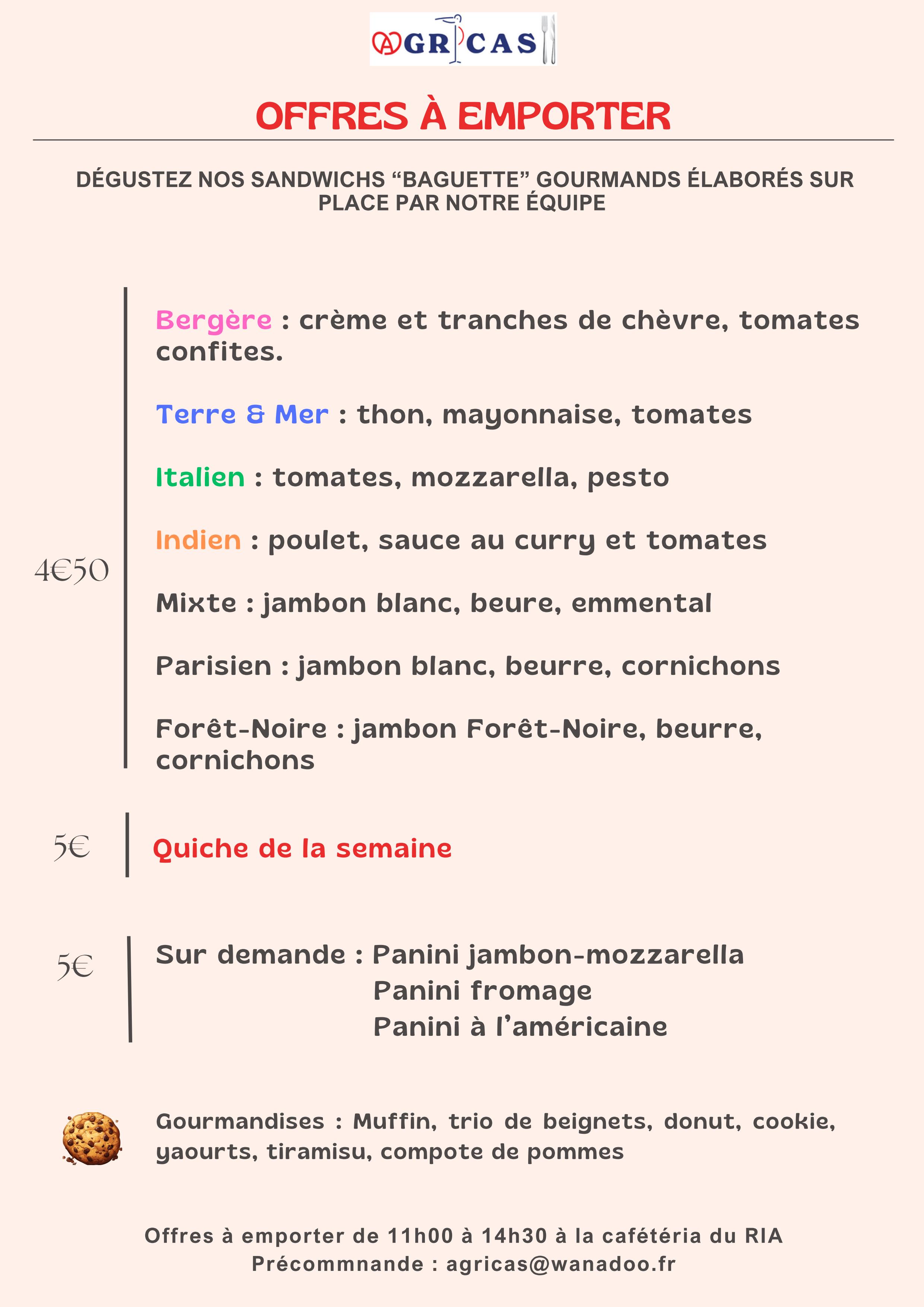 La Cafet vous attend du lundi au vendredi de 11h00 à 14h30 avec un offre de diverses boissons chaudes et froides, mais découvrez et dégustez également nos sandwichs gourmands élaborés sur place par notre équipe (précommande à