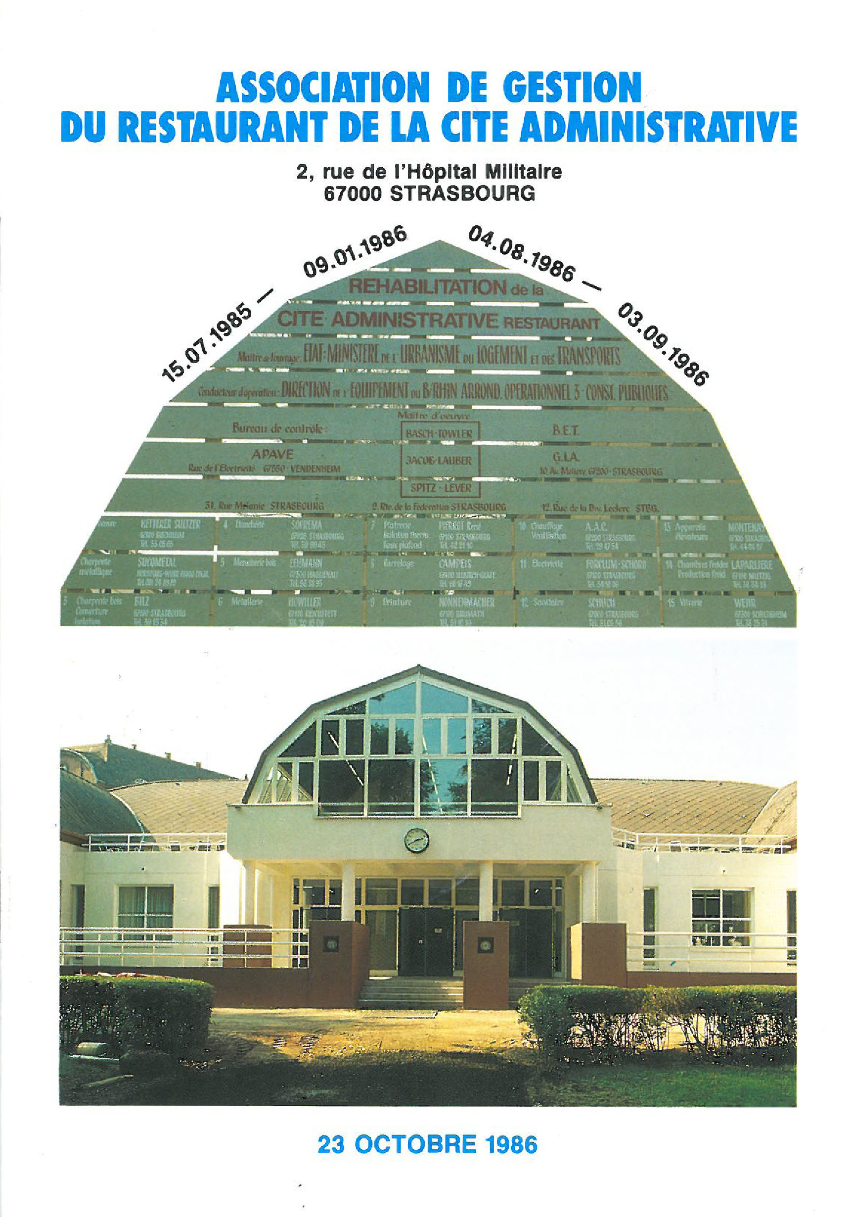 Ouvert le 3 février 1975, le restaurant Inter-administratif de la Cité Administrative de Strasbourg s'est développé au fil des années. Retour en images par la plaquette de présentation sur l'inauguration du nouveau bâtiment (cliquez sur l'image ci-dessous), réhabilité en 1986 et inauguré le 23 octobre de la même année.