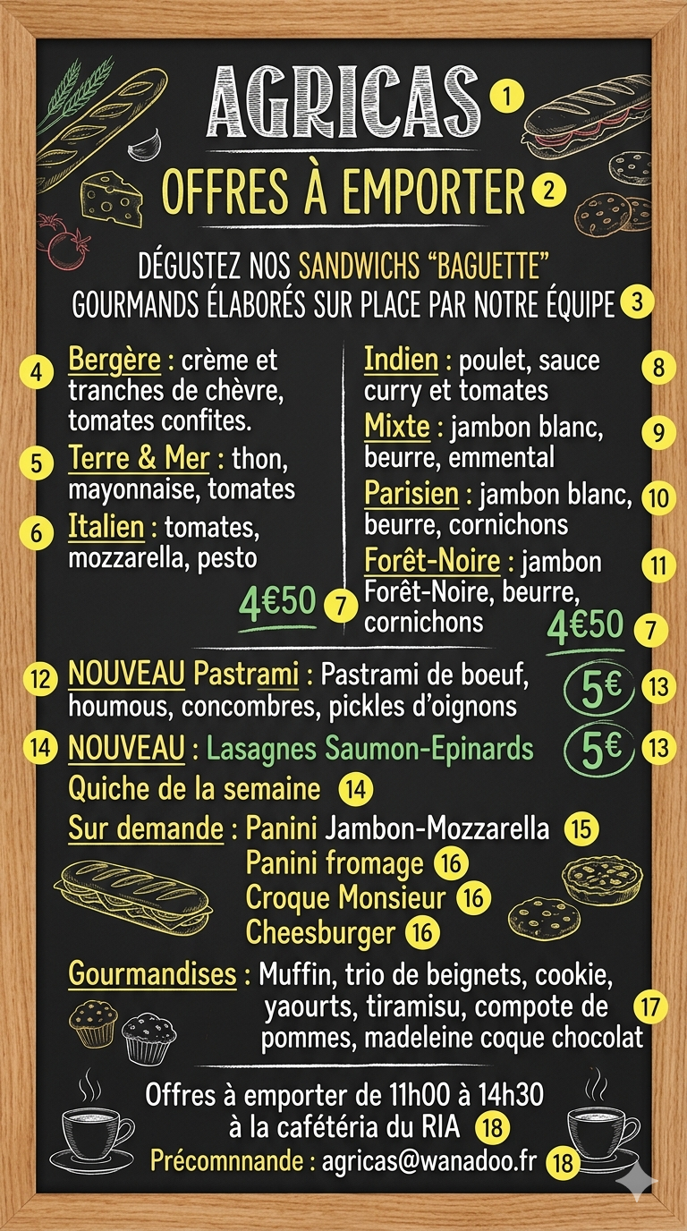 Dégustez nos sandwichs « Baguette » gourmands (4,50 €) élaborés sur place par notre équipe : Bergère : crème et tranches de chèvre, tomates confites Terre...